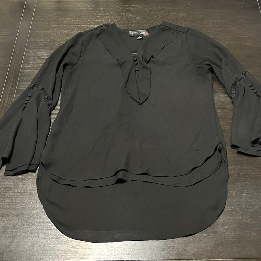 Black Lace-Inset Bell-Sleeve Tunic Blouse – Women’s Size 6