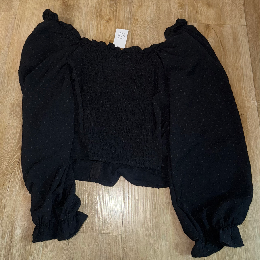 This chic black blouse is a versatile wardrobe staple, perfect for dressing up or keeping it casual. Designed with textured dot detailing, long puff sleeves, and a flattering smocked neckline and waist, this top offers a feminine and comfortable fit. Its lightweight fabric makes it ideal for year-round wear. Gently used and in excellent condition.
